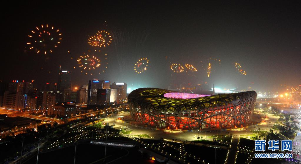 2008年8月8日晚,在“鳥巢”舉行的北京奧運(yùn)會(huì)開幕式上的焰火表演“歡慶笑臉”。(新華社記者楊磊攝)
