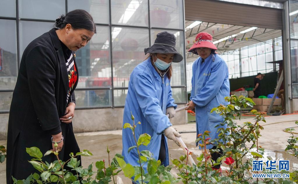 在金山玫瑰產(chǎn)業(yè)基地,陳望慧(左)在指導(dǎo)工人給玫瑰花澆水(4月14日攝)。新華社記者 王曦 攝