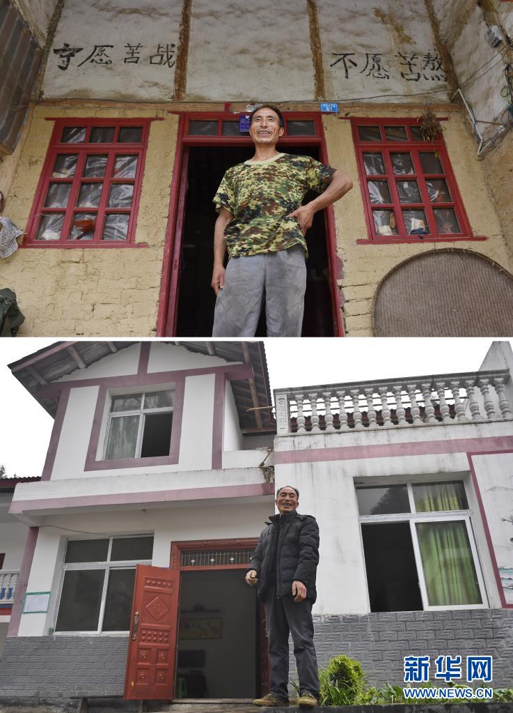 拼版照片:上圖是2016年8月22日,李國芝在老房門前留影,墻上有他寫的“寧愿苦戰(zhàn) 不愿苦熬”八個大字;下圖是2020年4月2日,李國芝在他現(xiàn)在居住的新房前留影。新華社記者 劉坤 攝