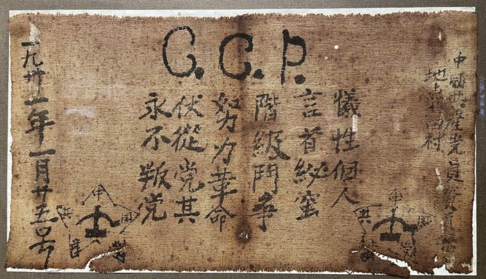1931年1月25日,在榨油坊昏暗的油燈下,他拿出一塊早已準(zhǔn)備好的紅布,在上面寫下了那段誓詞,并留下了自己的名字和入黨的時(shí)間、地點(diǎn)。