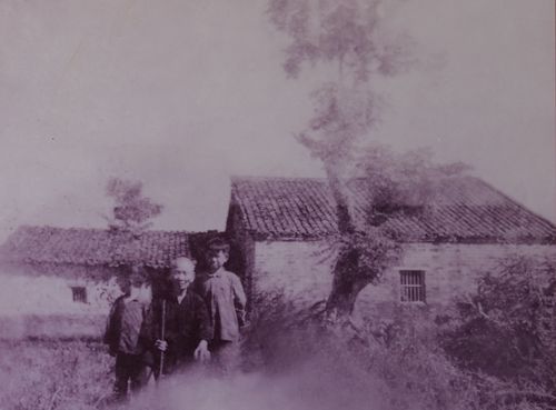 上圖為賀佐武(左一)、賀佐文與爺爺賀頁(yè)朵在榨油坊前的合影。