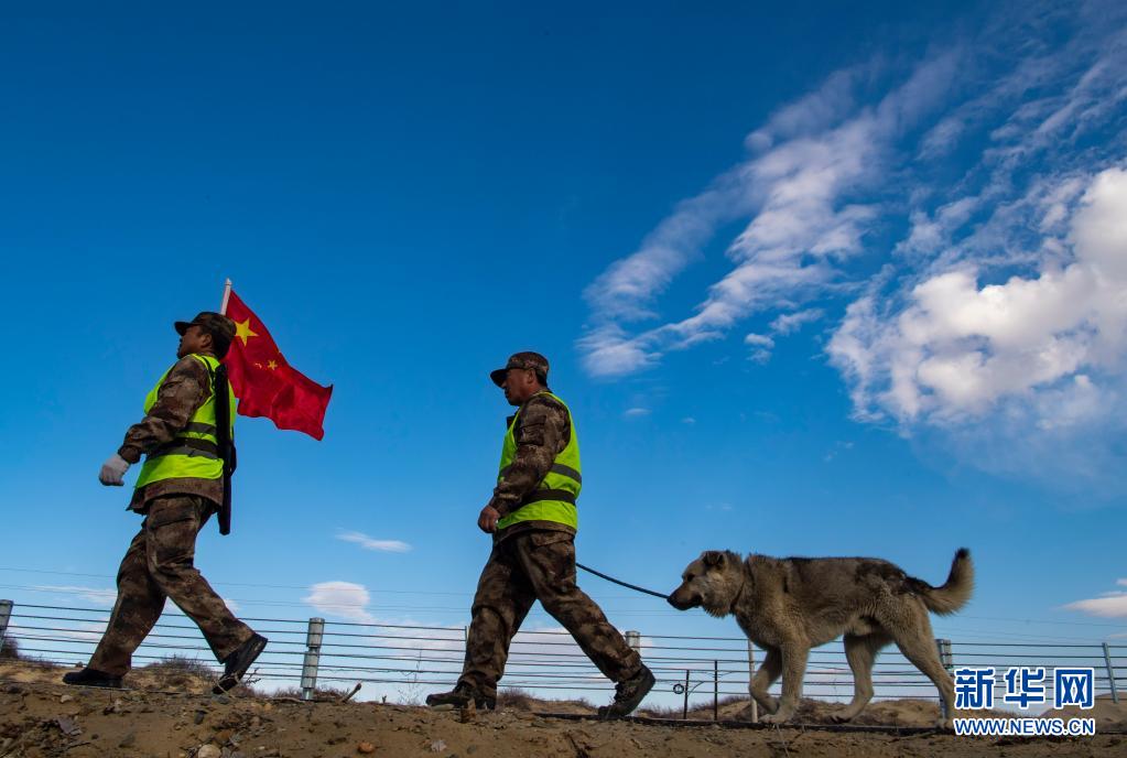 新疆生產(chǎn)建設(shè)兵團(tuán)第10師185團(tuán)職工馬軍武(右)在巡邏途中(4月9日攝)。新華社記者 胡虎虎 攝