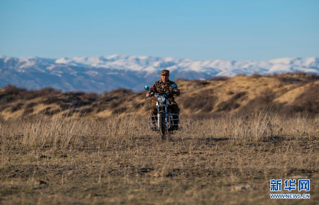 新疆生產(chǎn)建設(shè)兵團(tuán)第10師185團(tuán)職工馬軍武騎摩托行駛在管護(hù)轄區(qū)內(nèi)(4月9日攝)。新華社記者 胡虎虎 攝