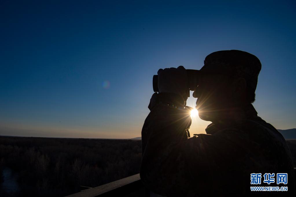 新疆生產(chǎn)建設(shè)兵團(tuán)第10師185團(tuán)職工馬軍武在瞭望塔上觀察管護(hù)轄區(qū)(4月9日攝)。新華社記者 胡虎虎 攝