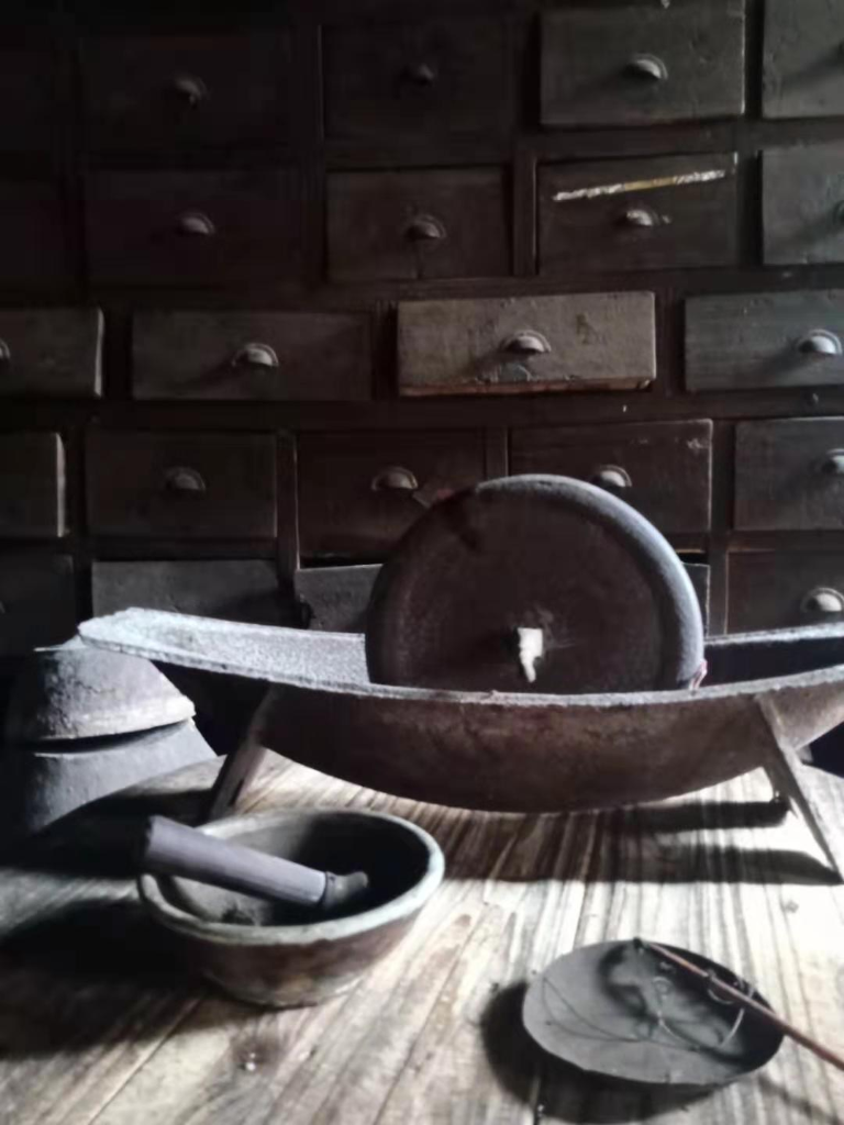 珍藏在中藥鋪里的木沖子、鐵船、研缽、小秤、中藥柜等。(何云雄 攝)