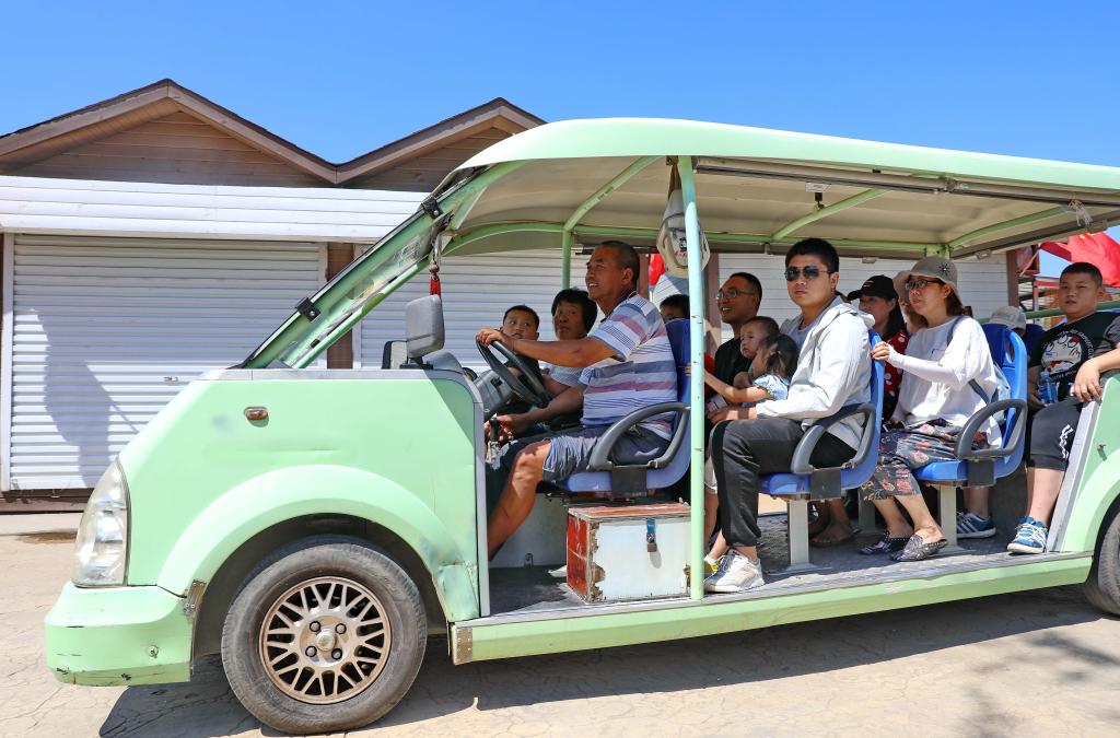 在西柏坡,村民駕駛電動(dòng)車帶領(lǐng)乘客觀光游覽(2019年8月16日攝)。新華社記者楊世堯攝