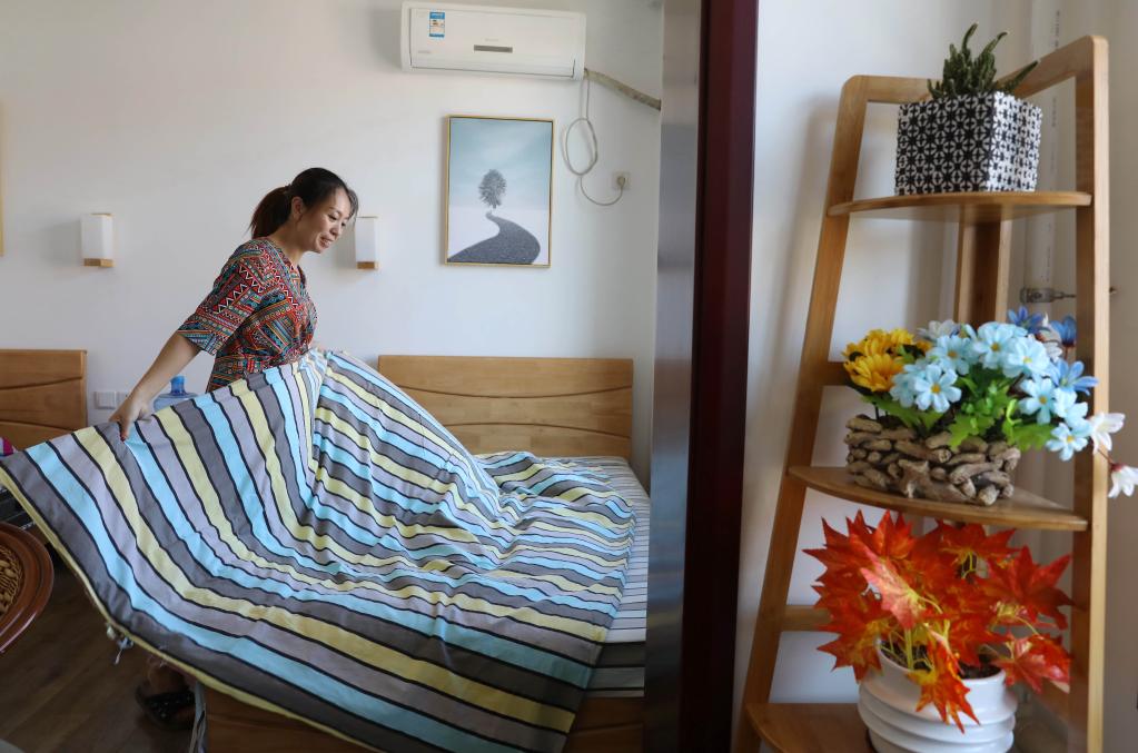 西柏坡鎮(zhèn)梁家溝村村民在民宿內(nèi)整理客房(2019年8月16日攝)。新華社發(fā)