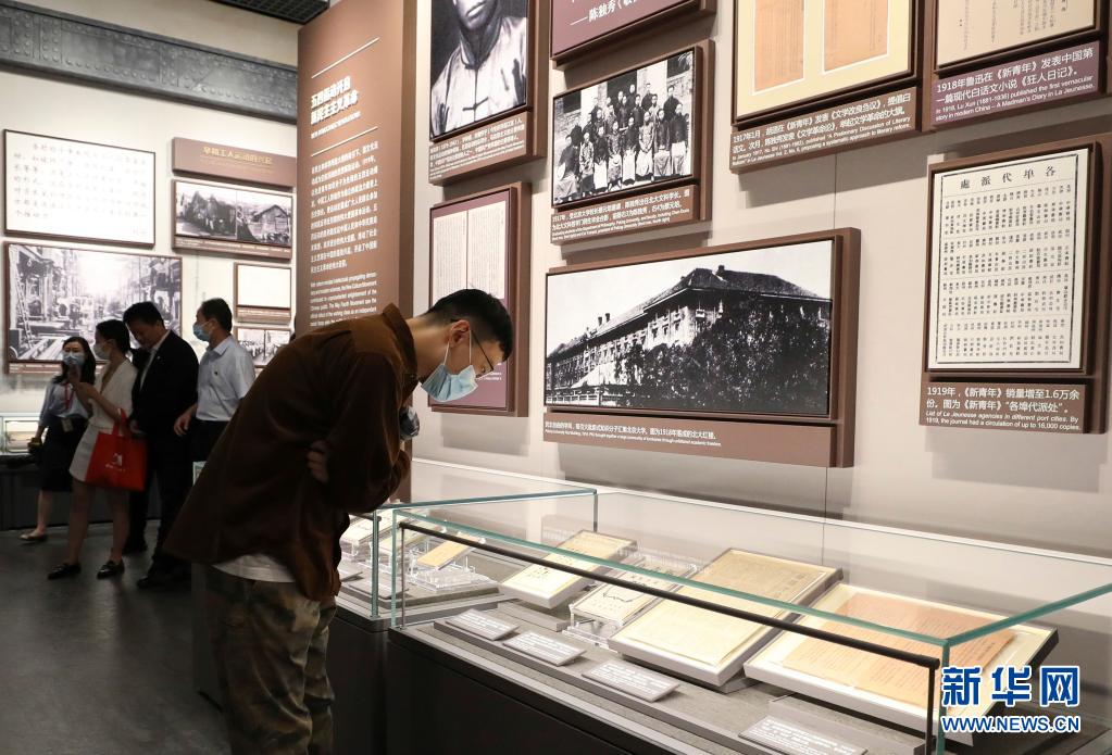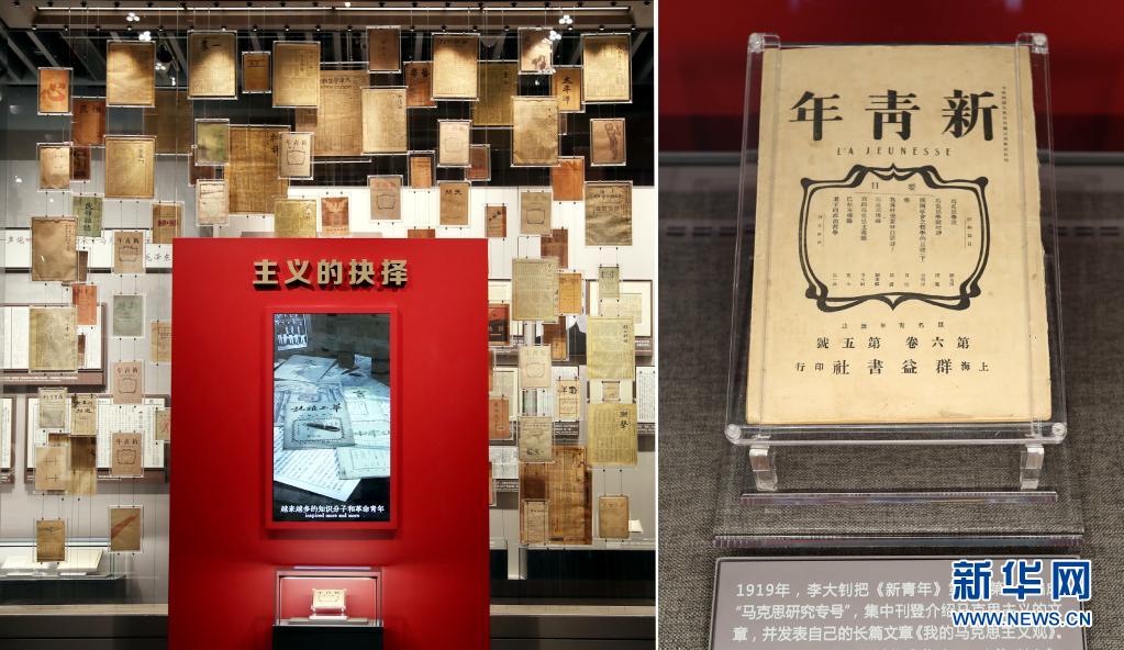 大型立體式視覺置景名為“主義的抉擇”,100件五四運(yùn)動(dòng)前后傳播馬克思主義、社會(huì)主義的報(bào)紙雜志,錯(cuò)落陳列在玻璃墻上。其中,《新青年》第6卷第5號(hào)“馬克思研究專號(hào)”在前端“高光”展示,這期“專號(hào)”標(biāo)志著馬克思主義在中國的傳播進(jìn)入了較為系統(tǒng)的階段(6月1日攝)。新華社記者 劉穎 攝