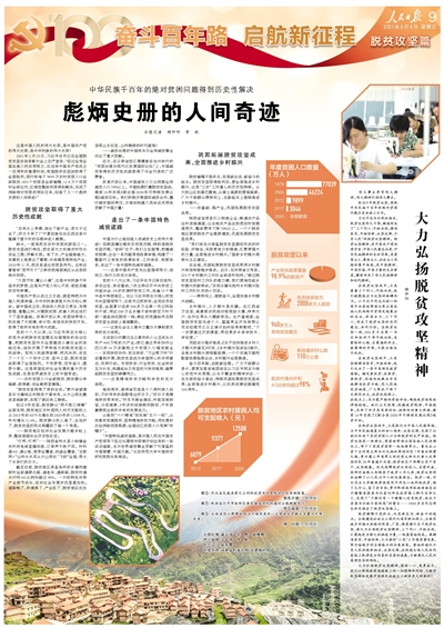2021年2月25日,習(xí)近平總書(shū)記在全國(guó)脫貧攻堅(jiān)總結(jié)表彰大會(huì)上莊嚴(yán)宣告:“經(jīng)過(guò)全黨全國(guó)各族人民共同努力,在迎來(lái)中國(guó)共產(chǎn)黨成立一百周年的重要時(shí)刻,我國(guó)脫貧攻堅(jiān)戰(zhàn)取得了全面勝利,現(xiàn)行標(biāo)準(zhǔn)下9899萬(wàn)農(nóng)村貧困人口全部脫貧,832個(gè)貧困縣全部摘帽,12.8萬(wàn)個(gè)貧困村全部出列,區(qū)域性整體貧困得到解決,完成了消除絕對(duì)貧困的艱巨任務(wù),創(chuàng)造了又一個(gè)彪炳史冊(cè)的人間奇跡!”