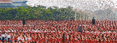 大會現(xiàn)場,和平鴿展翅高飛,現(xiàn)場觀眾一片歡騰。