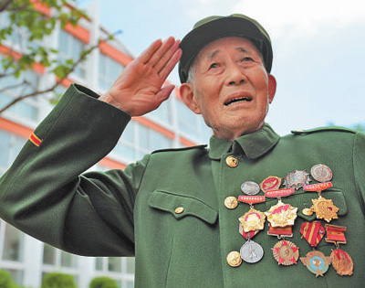 年近期頤,褶皺的臉上寫滿歲月的痕跡,但每當(dāng)國(guó)歌和軍歌旋律響起,老人總是目含敬意,深情致以軍禮。這一刻,老戰(zhàn)士神采奕奕。
