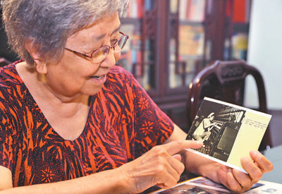 黃寶妹在上海的家中翻看自己做紡織女工時(shí)的老照片(六月十日攝)。