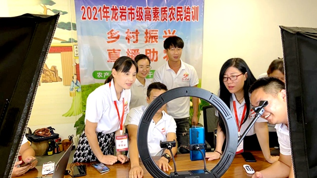 龍巖市舉辦2021年高素質(zhì)農(nóng)民直播電商培訓(xùn)班,圖為學(xué)員們正在進(jìn)行分組直播實訓(xùn)。龍巖市農(nóng)業(yè)農(nóng)村局供圖