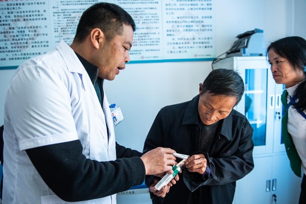 醫(yī)生在由澳門援建的從江縣小翁村衛(wèi)生室內(nèi)給村民講解用藥須知(2019年11月15日攝)。新華社記者 陶亮 攝