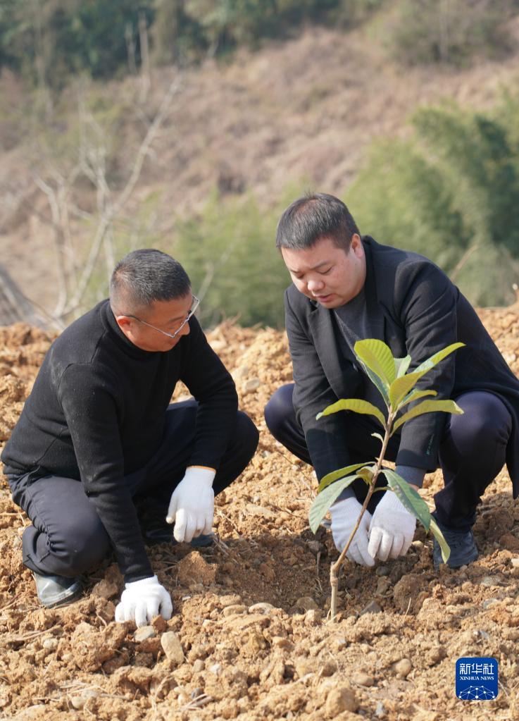 2月25日,漢濱區(qū)建民街道青春村支部副書記唐振(右)在村子產(chǎn)業(yè)園種植枇杷樹。