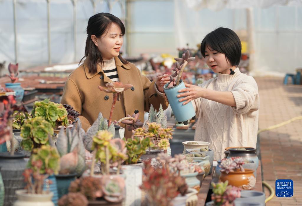 2月24日,漢濱區(qū)建民街道忠誠村黨支部委員、村監(jiān)委會(huì)主任胡代芝(右)在村子大棚內(nèi)向游客介紹多肉盆景。