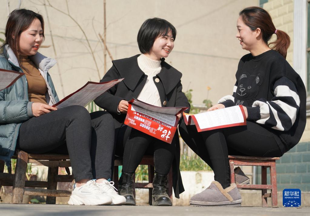 2月24日,漢濱區(qū)建民街道忠誠村黨支部委員、村監(jiān)委會(huì)主任胡代芝(中)向村民發(fā)放講解社區(qū)工廠招聘彩頁。
