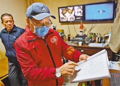 為改善社區(qū)治安狀況,陜西省西安市蓮湖區(qū)桃園路街道勞動一坊社區(qū)成立了一支由黨員和群眾組成的“螢火蟲”志愿巡邏隊,協(xié)助社區(qū)開展治安巡邏、糾紛調(diào)解等工作。圖為巡邏隊隊員在查看社區(qū)出入人員的登記信息。