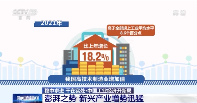 一開年,處處干勁十足,我國工業(yè)領(lǐng)域真是“新”意澎湃。其實一直以來,我國新興產(chǎn)業(yè)的發(fā)展勢頭都可以用“迅猛”這個詞來形容,2021年我國高技術(shù)制造業(yè)增加值比上年增長18.2%,高于全部規(guī)上工業(yè)平均水平8.6個百分點。
