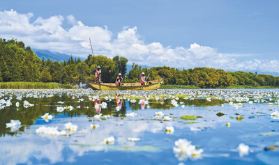 云南省大理白族自治州持續(xù)推進(jìn)洱海水環(huán)境整治、水生態(tài)修復(fù)等工作,環(huán)湖生態(tài)環(huán)境逐步改善。圖為環(huán)衛(wèi)工人在海菜花盛開(kāi)的洱海中進(jìn)行湖面清潔。