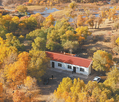 內(nèi)蒙古自治區(qū)額濟(jì)納胡楊林國(guó)家級(jí)自然保護(hù)區(qū)七道橋管護(hù)站,護(hù)林員的住所掩映在茂密的胡楊林中。