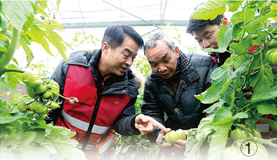 圖①:廣西壯族自治區(qū)融安縣大良鎮(zhèn)古蘭村,駐村第一書記(左)給農(nóng)戶講解番茄管護知識。