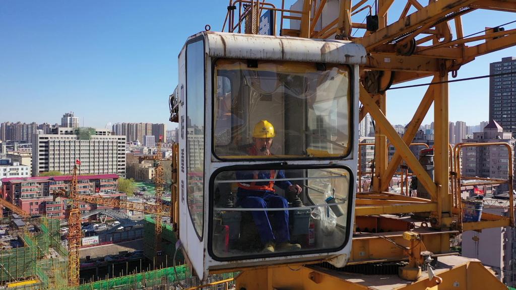 吉克達(dá)富正在觀察班組內(nèi)的塔式起重機(jī)。新華社記者李紫薇 攝(2022年3月21日)