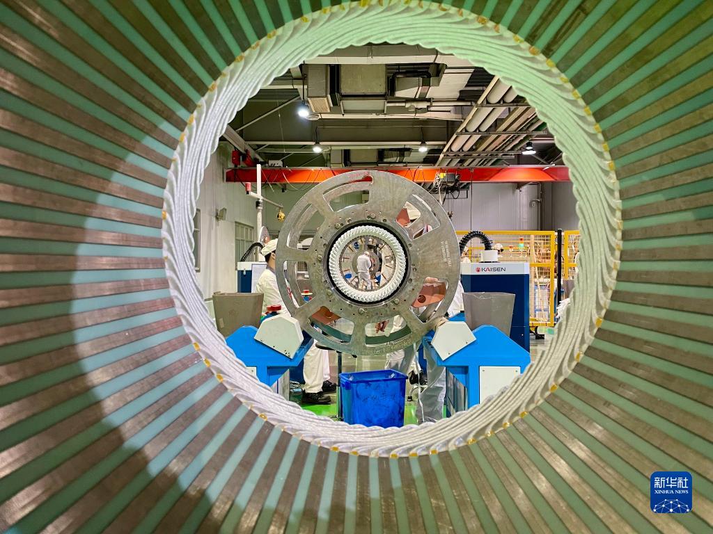 在中車株洲電機(jī)公司廠房中拍攝的制造中的軌道交通裝備牽引系統(tǒng)(2021年7月3日攝)。新華社記者 蘇曉洲 攝