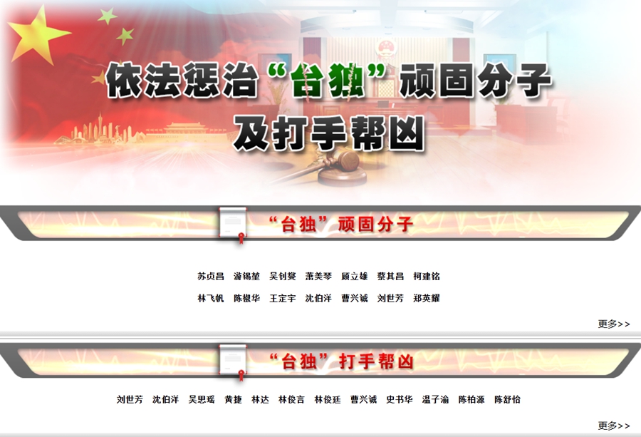大陸方面堅持依法懲“獨”,不斷提升打擊“臺獨”分裂活動、挫敗“臺獨”分裂圖謀的力度、精度。有關(guān)部門公布涉嫌參與策劃、指揮及對大陸實施網(wǎng)絡(luò)攻擊滲透的“臺獨”網(wǎng)軍身份信息;推出“‘臺獨’打手、幫兇迫害臺灣同胞惡劣行徑舉報專欄”;對“臺獨”頑固分子沈伯洋在大陸關(guān)聯(lián)企業(yè)實施懲戒;懸賞通緝涉嫌參與實施網(wǎng)絡(luò)攻擊的民進(jìn)黨當(dāng)局黑客;公布“臺獨水軍”身份信息;公開征集臺軍“心戰(zhàn)大隊”核心骨干的違法犯罪線索;對沈伯洋涉嫌分裂國家犯罪立案偵查。這一系列“組合拳”對“臺獨”分裂勢力產(chǎn)生震懾效應(yīng),獲得兩岸輿論普遍肯定。