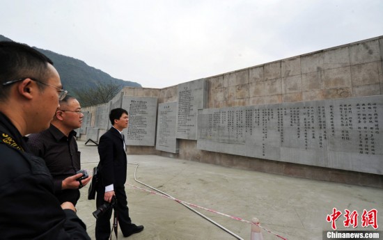 四川什邡市即將落成的長51.2米、高2.28米的地震詩歌墻位于穿心店“5·12”地震遺址廣場,以銘記2008年5月12日突如其來的災(zāi)難。經(jīng)專家篩選,蘇善生的《孩子,快抓緊媽媽的手》、王平久的《生死不離》等20首地震詩歌上墻,作者既有中國詩壇的名家,也有在網(wǎng)絡(luò)走紅的詩歌新人。圖為民眾參觀詩歌墻。(中新社發(fā) 劉忠俊 攝)