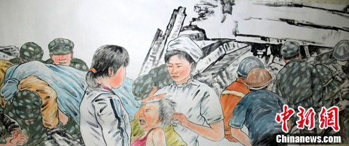 千鈞一發(fā)紅旗展,十萬男兒緊當(dāng)先……汶川地震三周年,陜西青年畫家郭永潔以5·12汶川地震中備受關(guān)注的人物為素材,創(chuàng)作完成頌揚(yáng)人民軍隊(duì)國畫《震起之豐碑》人物長卷,長達(dá)125米,涉及人物600多名。