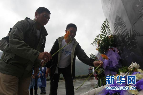5月9日,在“5.12”汶川地震重災(zāi)區(qū)四川省青川縣東河口地震遺址公園,在青川參加災(zāi)民安置房援建工作的香港迪士尼樂園志愿者面向遇難者紀念碑獻花。東河口地震遺址公園是汶川大地震第一個地震遺址保護紀念地,震后保留的豐富地貌形象地展現(xiàn)著那場大地震的傷痛與記憶。在“5·12”四川汶川大地震3周年來臨之際,遺址公園吸引了來自各地的人們到此駐足、默哀,緬懷逝者。(新華社記者 任正來 攝 )