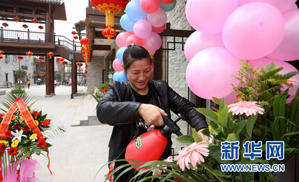 4月16日,在北川巴拿恰步行街上,一家剛剛開業(yè)的花店員工在給鮮花噴水。