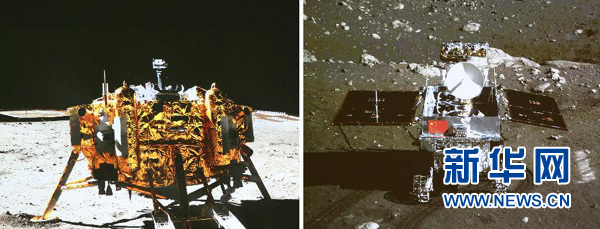 12月15日晚,正在月球上開(kāi)展科學(xué)探測(cè)工作的嫦娥三號(hào)著陸器和巡視器進(jìn)行互成像實(shí)驗(yàn),“兩器”順利互拍,嫦娥三號(hào)任務(wù)取得圓滿(mǎn)成功。未來(lái)幾天,在進(jìn)行科學(xué)探測(cè)的同時(shí),“玉兔”號(hào)月球車(chē)還將繞陸器繼續(xù)行駛,從不同角度與著陸器多次互拍。這是北京飛控中心大屏幕上顯示的嫦娥三號(hào)著陸器、巡視器互拍成像(拼版照片)。 新華社記者丁林?jǐn)z