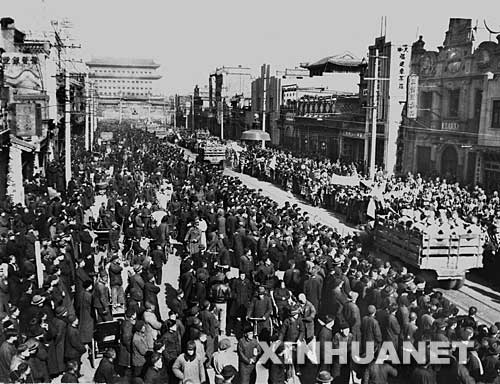 資料圖片:1949年1月31日舉行北平入城式。人民解放軍在萬眾歡呼中進入前門大街。新華社發(fā)
