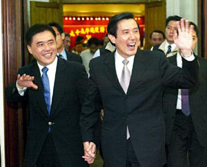 馬英九和臺(tái)北市長(zhǎng)郝龍斌近日參加臺(tái)軍退役將領(lǐng)春節(jié)聯(lián)誼餐會(huì),把酒言歡后手牽手走出“勝利廳”。圖片來(lái)源:臺(tái)灣《聯(lián)合報(bào)》