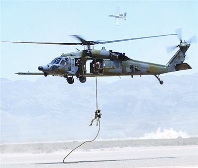 “黑鷹”直升機(jī)是美軍普遍使用的一種武裝直升機(jī),從美國西科斯基公司生產(chǎn)的雙渦輪軸引擎、單旋翼直升機(jī)S-70型發(fā)展而來的一種中型通用/攻擊直升機(jī)。除1名駕駛員外,機(jī)上可搭載11名士兵,主要執(zhí)行向前沿陣地運(yùn)送突擊部隊(duì)和對地面目標(biāo)進(jìn)行攻擊的任務(wù)。