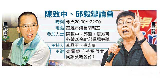 報道指出,壹電視邀請邱毅及陳致中電視辯論,原定上周四晚上在高雄市前鎮(zhèn)憲德宮廣場舉辦,因警方擔(dān)心沖突,未準(zhǔn)許集會;壹電視再協(xié)調(diào),當(dāng)晚三方達(dá)成共識改到高雄市勞工公園大禮堂。但邱毅昨發(fā)聲明,高雄市議長許崑源已商借高雄市議會會議廳為辯論場所,且辯論會不應(yīng)由一家媒體壟斷,應(yīng)開放所有媒體均可采訪轉(zhuǎn)播。