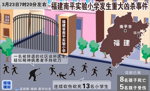 23日7時(shí)20分左右,正逢孩子們上學(xué)時(shí)間,福建省南平市實(shí)驗(yàn)小學(xué)門口,一名中年男子手持砍刀行兇,釀成13名小學(xué)生8死5傷的慘劇。“這真是飛來(lái)橫禍!”——南平市實(shí)驗(yàn)小學(xué)慘案中一位受傷學(xué)生家長(zhǎng)痛呼,她希望加強(qiáng)校園周邊治安管理,不要讓無(wú)辜的孩子再受到傷害。