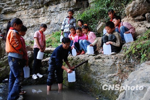 3月22日,印江自治縣中壩鄉(xiāng)大田村小學(xué)教師田如洪為學(xué)生接水。去年入冬以來,貴州省印江自治縣持續(xù)干旱少雨,降水量較常年同期明顯偏少,致使全縣大部分地方不同程度出現(xiàn)旱災(zāi),大部分鄉(xiāng)鎮(zhèn)和村寨供水水源可供水量嚴(yán)重不足,人畜飲水出現(xiàn)困難,許多農(nóng)作物受災(zāi)。據(jù)氣象部門預(yù)測,旱情還將持續(xù)加重,抗旱形勢較為嚴(yán)峻。 中新社發(fā) 譚永貴 攝