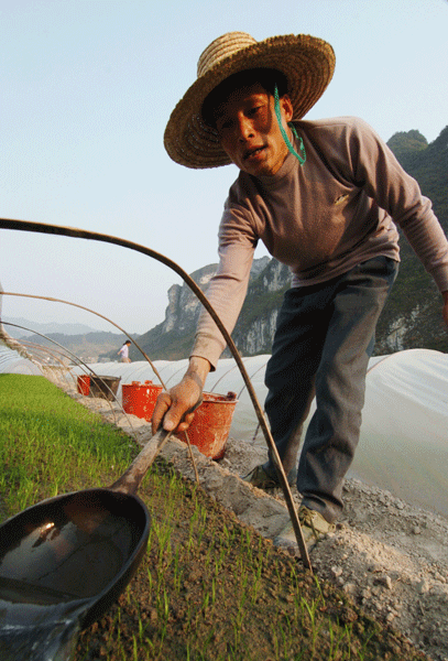 3月20日,廣西河池市東蘭縣蘭木鎮(zhèn)納核村納輝屯村民為運(yùn)用旱育秧技術(shù)的秧田澆水。新華社記者 李斌 攝
