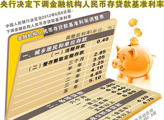 | 中國人民銀行決定,自2012年6月8日起金融機(jī)構(gòu)一年期存款基準(zhǔn)利率和一年期貸款基準(zhǔn)利率均下調(diào)0.25個百分點(diǎn),其他各檔次存貸款基準(zhǔn)利率及個人住房公積金存貸款利率相應(yīng)調(diào)整。 |