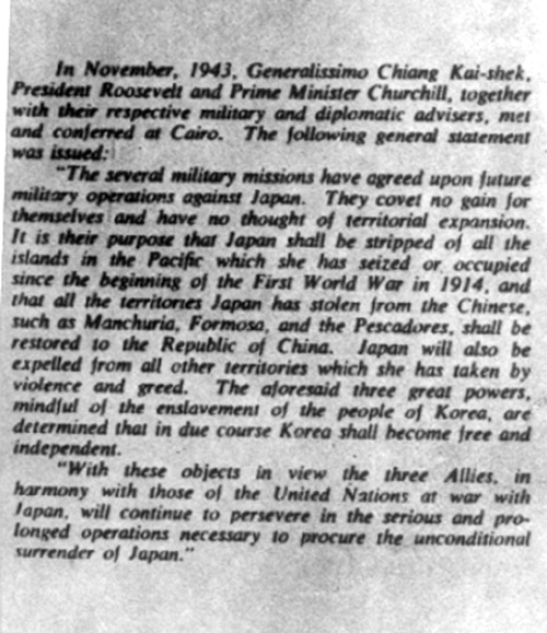 1943 年11月22日至26日,中、美、英三國首腦在埃及首都開羅會(huì)晤。在開羅會(huì)議中,三國首腦簽署了《開羅宣言》,規(guī)定“東北與臺(tái)灣必須歸還中國”。圖為《開羅宣言》英文原版。