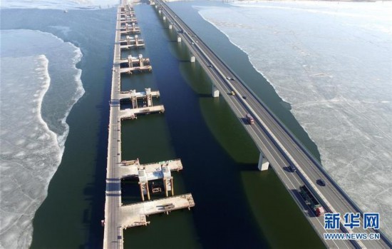 這是2017年2月14日航拍的橫跨官廳水庫的京張高鐵特大橋(左)與京張高速公路特大橋。京張高鐵是北京冬奧會(huì)交通配套工程。 新華社發(fā)(武殿森 攝)
