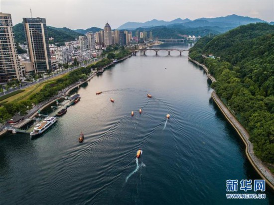 2018年7月23日,游客乘船在新安江浙江建德段江面上游玩(無人機(jī)拍攝)。 新華社記者 徐昱 攝