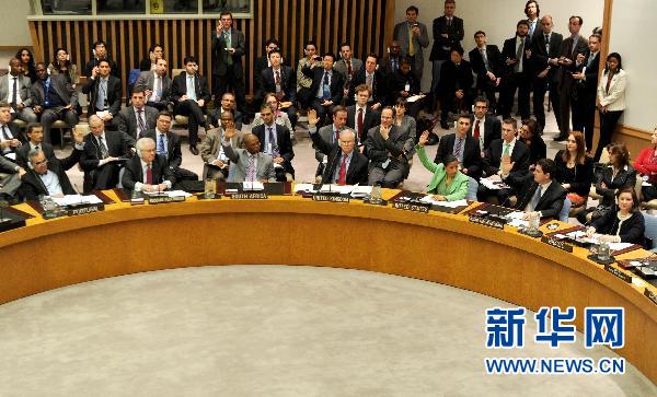 3月17日,在美國紐約聯(lián)合國總部,部分安理會(huì)理事國代表舉手投贊成票。當(dāng)日,聯(lián)合國安理會(huì)通過決議,決定在利比亞設(shè)立禁飛區(qū)。新華社記者申宏攝