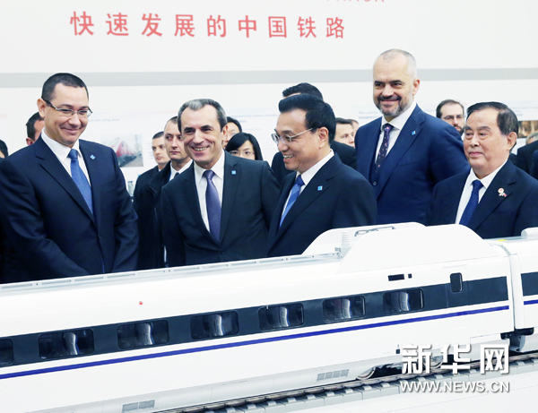 資料圖片:11月26日,國務院總理李克強與中東歐16國領導人在羅馬尼亞議會宮共同參觀中國鐵路等基礎設施及裝備制造展。 新華社記者 姚大偉 攝