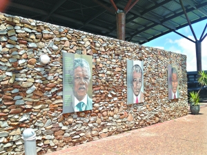 15日,在曼德拉故鄉(xiāng)古努村,媒體區(qū)入口處的紀念墻上掛著曼德拉頭像。 (本報記者邢磊攝)