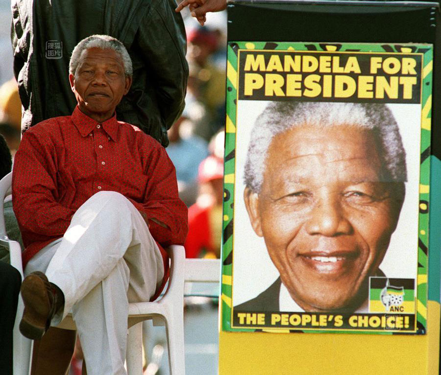 1994年4月23日,非國(guó)大主席曼德拉坐在自己南非總統(tǒng)競(jìng)選海報(bào)旁邊。