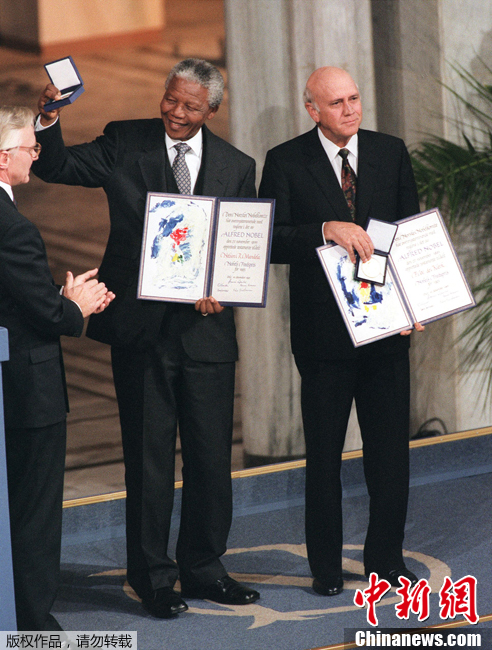 1993年10月15日,諾貝爾和平委員會授予曼德拉諾貝爾和平獎,以表彰他為廢除南非種族歧視政策所作出的貢獻,和他一起受獎的還有時任南非總統(tǒng)德克勒克(右)。圖為1993年12月10日,諾貝爾和平獎頒獎典禮上,曼德拉和德克勒克向記者示意。